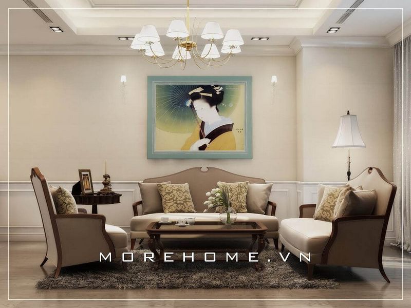 Bộ sofa gỗ óc chó cao cấp bọc da màu kem mềm mại của phòng khách căn hộ đã tạo ra ấn tượng với thiết kế tân cổ điển sang trọng, tinh tế.